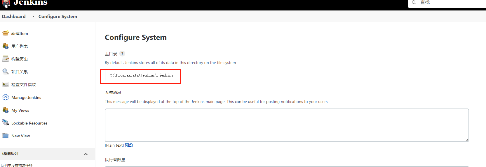 jenkins会有一个workspace文件夹,这个文件夹下会根据流水线创建对应的文件夹并在对应的文件夹下进行编译运行脚本。我们可以修改它的默认路径,重启jenkins生效,首先找到jenkins配置文件路径,manage jenkins->configure System: