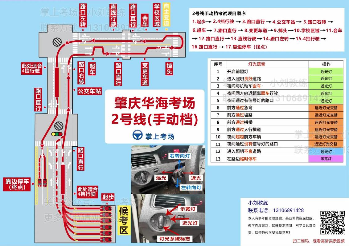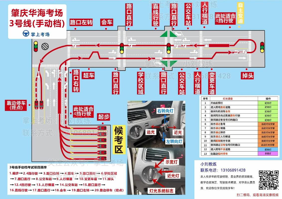 检查座椅,灯,注意座椅远近和高低,后视镜。准备完毕,绕车,上车,安全带,答题,踩离合刹车,转向灯挂挡手刹,松离合脚刹,半联动。快到箭头位置关转向灯,到箭头位置开转向灯,进入车道,看前车距离做加减档。做完停止在路口等红绿灯,转向,外侧车道,准备超车项目,超车项目注意车速20就行,超完成踩斑马线点刹,会车点刹,变道,斑马线两个,斑马线后马上是公交车站,调头,加至二档,变道,三个斑马线,直行,变道,右转转向灯,转完关转向灯,一档停车,打开转向灯,进入,听到靠边停车语音停好车盖住第二个箭头,空挡手刹,熄火,等几秒无语音播报就直接解安全带下车。